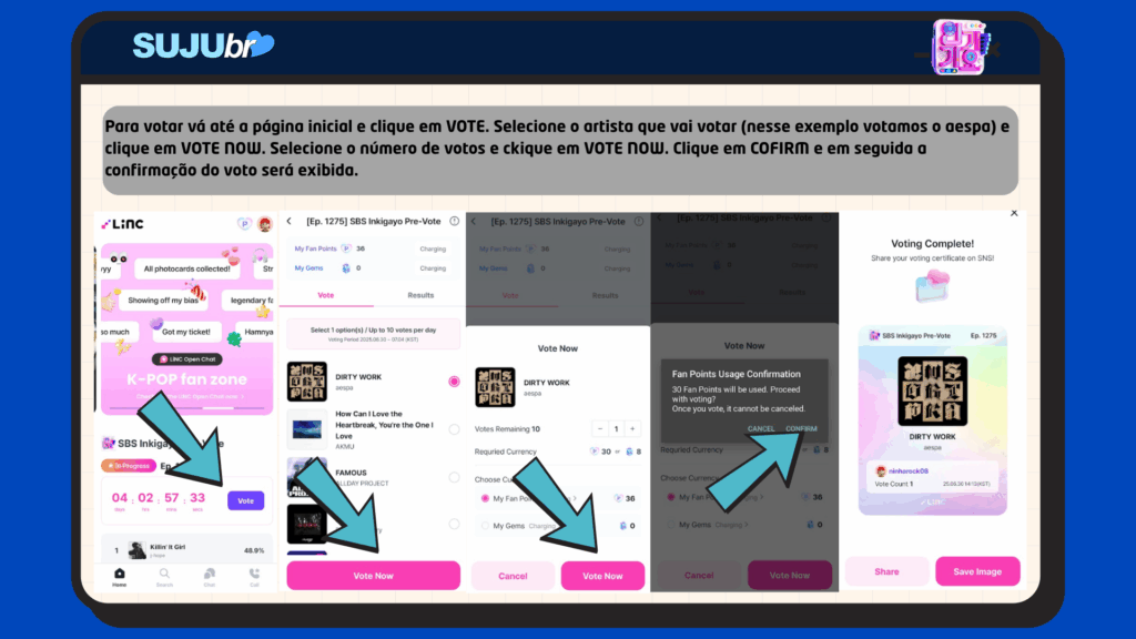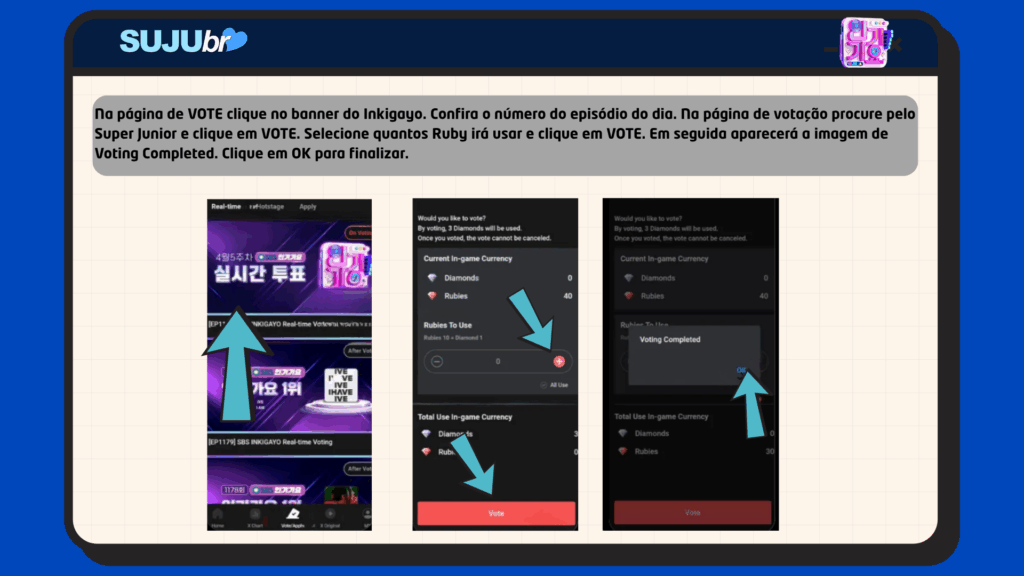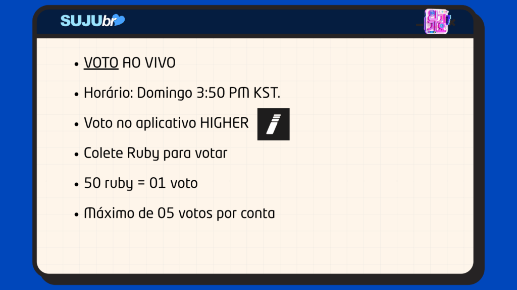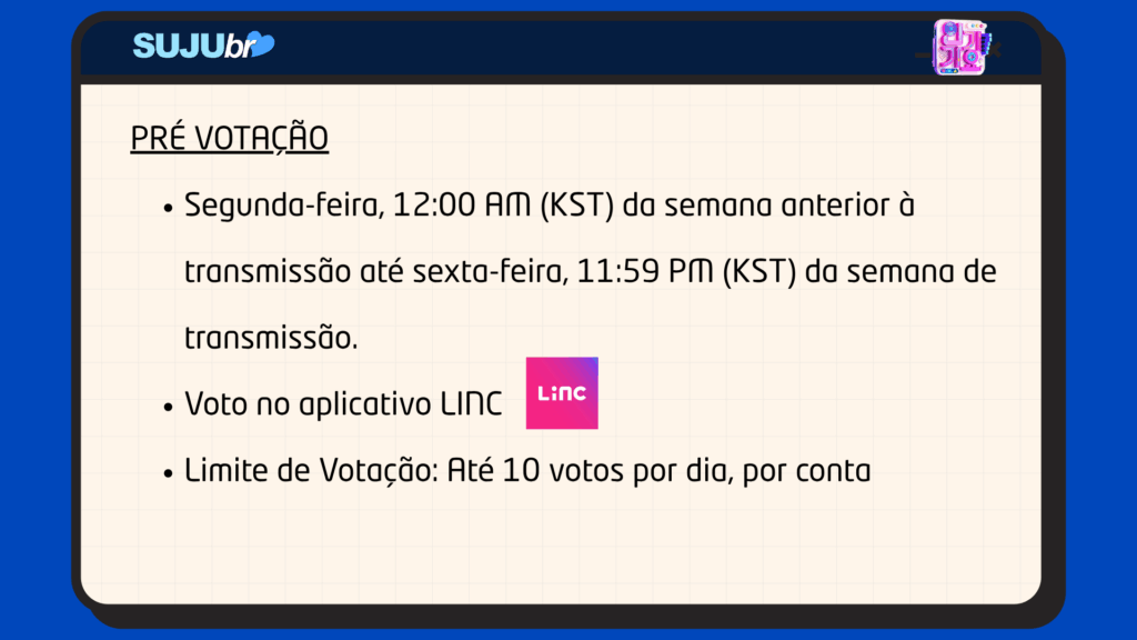 Pré-votação: Segunda das 12:00 AM (KST) da semana anterior à transmissão até sexta as 11:59 PM (KST) da semana de transmissão.