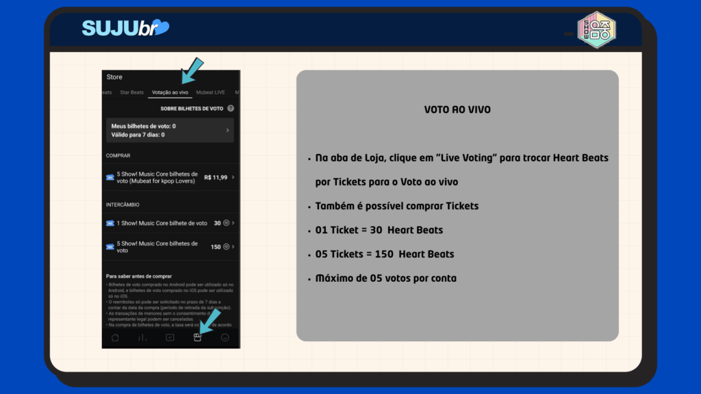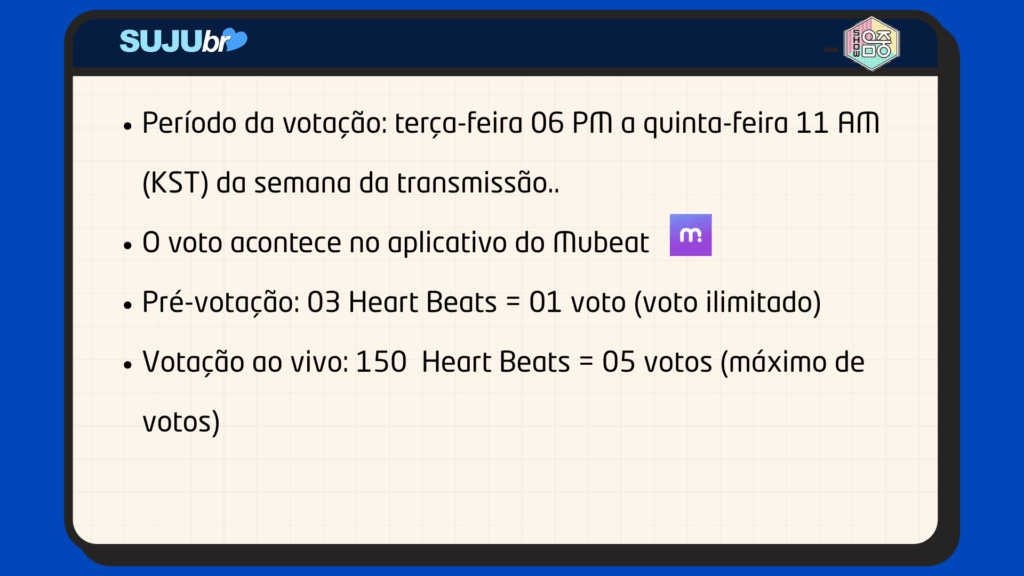 – Pré-votação e Voto ao vivo no aplicativo Mubeat (tutorial abaixo).